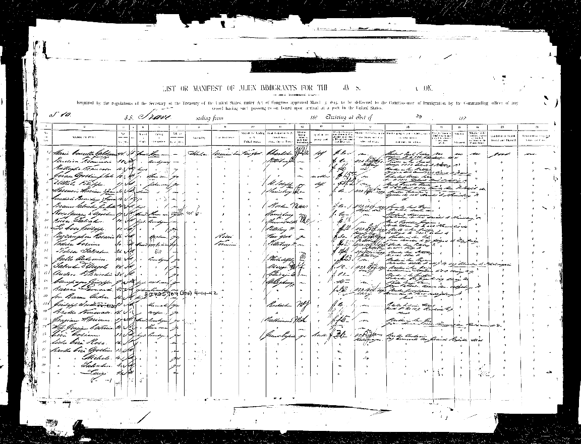 Line 23 Graziano, Mariano Age : 27 Country of Origin : Italy Arrival Date : April 25, 1900 Departure Date : April 13, 1900 Final Destination : Baltimore Whether going to join a relative and what relative and name and address: Brother in Law Mariano, 1332 Fremont Ave Port of Embarkation : Genoa Port of Debarkation : New York Last Residence: Termini By Whom was passage paid: Self Possesion of Money: $15.00 Ship's Name : Trave Occupation : Countryman Gender : Male Marriedor Single: Married Captain's Name : H Chrisdoffers Purpose for Travel : Staying in the USA Mode of Travel : Steerage Line 24 Graziano, Caterina Age : 21 Country of Origin : Italy Arrival Date : April 25, 1900 Departure Date : April 13, 1900 Final Destination : Baltimore Whether going to join a relative and what relative and name and address: Brother Mariano, 1332 Fremont Ave Port of Embarkation : Genoa Port of Debarkation : New York Last Residence: Termini By Whom was passage paid: Self Possesion of Money: $15.00 Ship's Name : Trave Occupation : Housekeeper Gender : Female Married or Single: Married Captain's Name : H Chrisdoffers Purpose for Travel : Staying in the USA Mode of Travel : Steerage Orginial Ship Record Below: First Page and Ship Manifest |